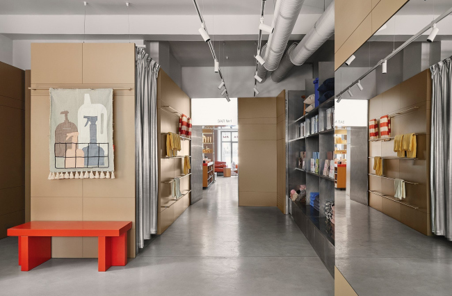 Первый зал – мультибрендовый, насыщенный разнообразными предметами интерьера. Второй зал посвящен исключительно текстилю бренда Morpheus. Такое разделение создает разный темп восприятия: первый зал – живой и насыщенный, второй – более спокойный и сосредоточенный на бренде владельцев магазина. Чтобы снизить визуальную нагрузку на посетителей, в проекте предусмотрена зона отдыха у входа: кресла и сиденья на подоконниках, где можно сделать паузу, «переварить» впечатления и задержаться подольше.