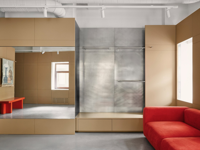 В основе концепции – эстетика советского бюро находок. Она несет в себе несколько смысловых пластов: отсылку к истории страны, идею структуризации – своеобразной картотеки, а также ассоциацию с местом, где можно найти то, что долго искал. В этом образе заложена и особая домашняя теплота – в сочетании форм и фактур. Отсюда сложная теплая цветовая палитра, панели из переработанного пластика и лакированная мебель в духе 70-х годов.