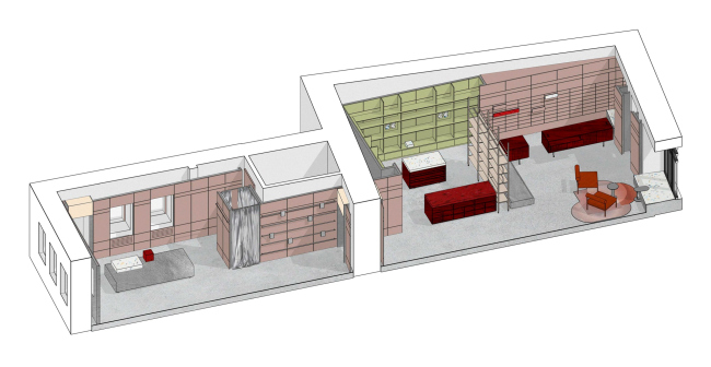 Так как шоурум расположен в историческом здании, согласование перепланировки могло бы значительно затянуть стройку. Поэтому архитекторы сознательно решили трансформировать пространство только с помощью мебельных конструкций. Стеллажи вдоль стен образовали «коробку в коробке», что позволило создать комфортную планировку и ускорить реализацию.