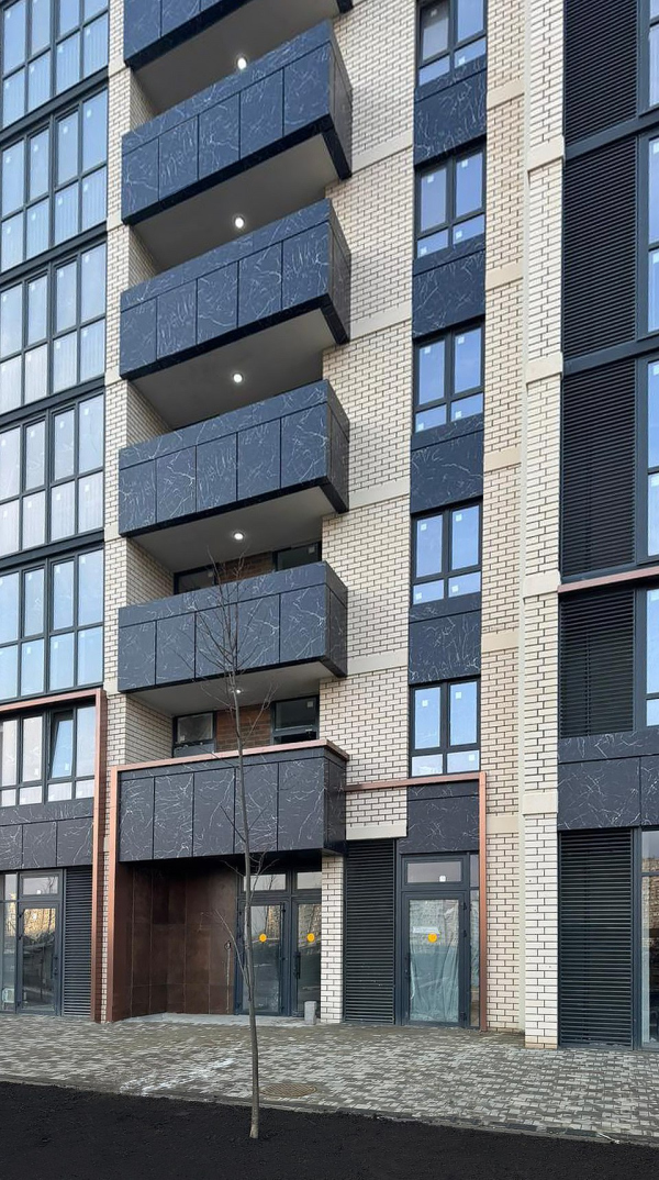 Например, в проекте ЖК «Ever» в зонах парадных входов используются СКП SIBALUX с технологией цифровой печати под разные типы камня. Нижний ярус фасада выполнен из клинкерного кирпича, а стальные композитные панели с текстурой камня органично дополняют его яркими акцентами (принты SA-2412, SA-OX2417).