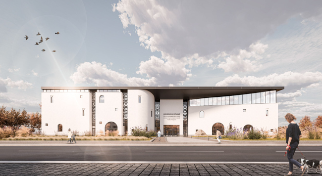 Главный фасад предполагается выполнить из кладки легкого бетона в штукатурке, чтобы подчеркнуть массивность стен в сочетании с игрой разновеликих оконных проемов. В качестве дополнительного декора выбраны металлические решетчатые элементы, стилизованные под резные причелины и полотенца традиционного деревянного зодчества. Полукруглый элемент фасада, примыкающий к главному входу, задуман как отсылка к апсидам древнерусских каменных церквей. Элементы, навеянные зодчеством Старой Ладоги, выполнены на контрасте с современными материалами, такими как витражное остекление.