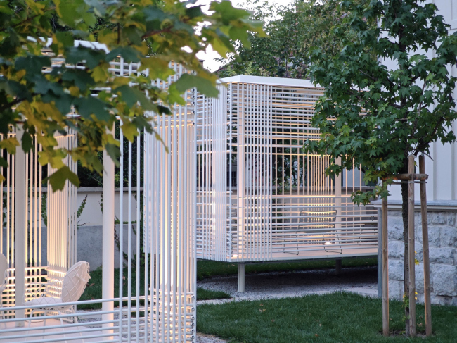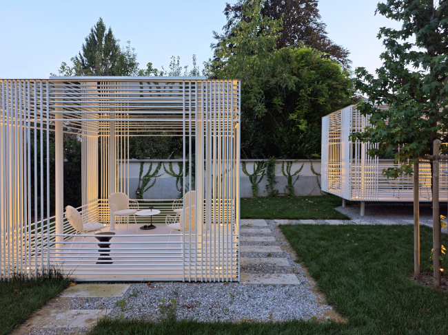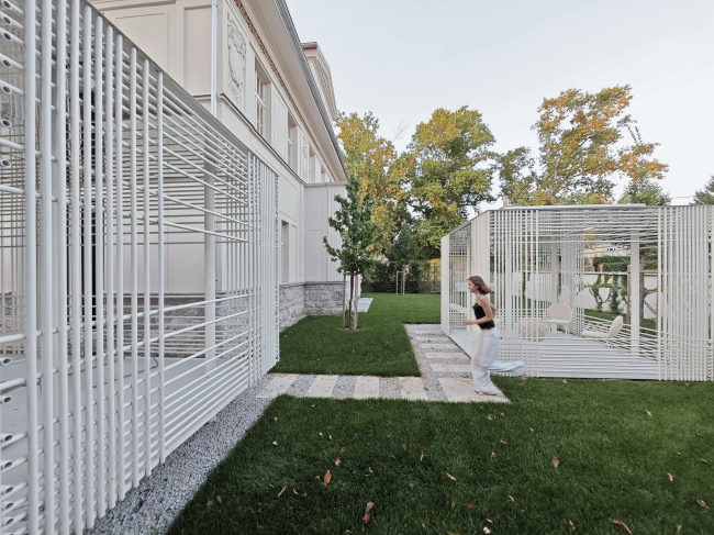 Готовность к новому подчеркивают и два павильона-беседки, пристроенных со стороны бокового и садового фасадов. Один из них связан с интерьером, второй чуть отдален и расположен на месте изначально стоявшего здесь павильона. Легкие белые решетки из круглых стальных профилей толщиной всего 2 см проницаемы для взгляда и напоминают объемный многослойный каркас. У них нерегулярный ритм проемов, что позволяет регулировать уровень проницаемости в зависимости от угла обзора. Кроме того, за счет игры с плотностью расположения прутьев удалось раскрыть интерьеры в сад.