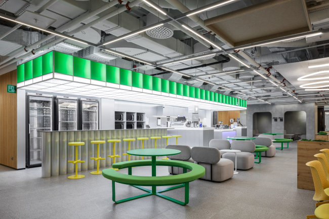 Для поддержания физического и психологического здоровья студентов и преподавателей спроектированы разнообразные зоны для работы, обучения и отдыха, включая социальные и многофункциональные пространства, а также уединенные рабочие места. В университете есть коворкинг-кафе, уютные кофе-поинты, кухни и вендинговые автоматы на разных этажах здания. Все это обеспечивает доступ к здоровому питанию и удобный ритм повседневной жизни.