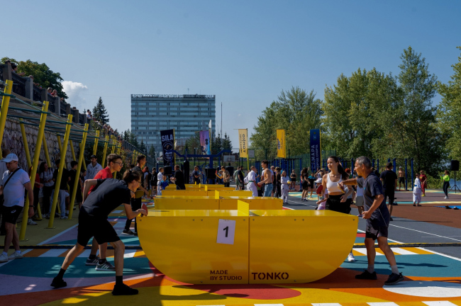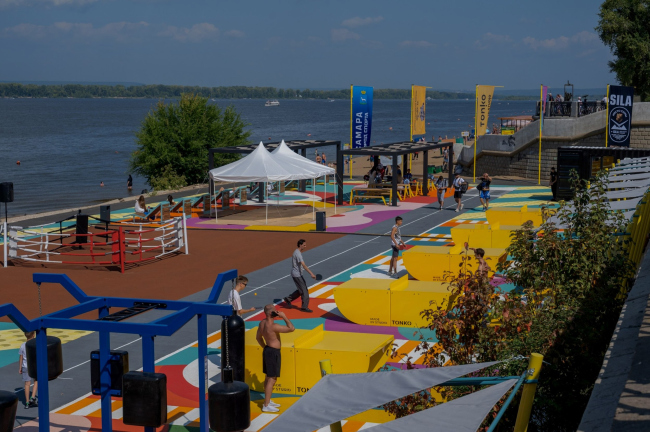 По проекту дизайн-студии TONKO на набережной Волги в Самаре появилась яркая площадка для тренировок на открытом воздухе. Уличная спортивная мебель произведена по чертежам архитекторов, а для зонирования активно используется цвет. Можно заниматься йогой, боксом, паркуром, настольным теннисом или же просто отдыхать в шезлонге.