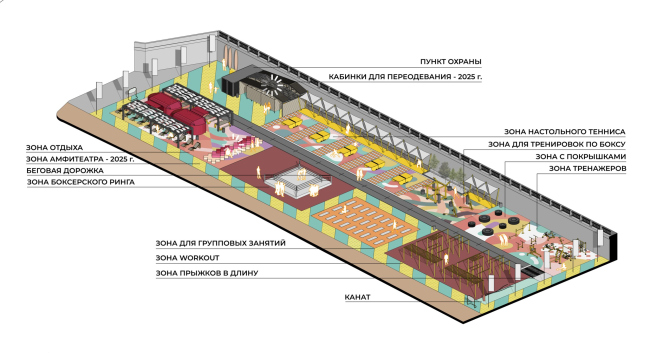 Спортивный блок включает площадку с тренажерным оборудованием, а также зоны йоги, бокса, воркаута, тенниса и паркура. Функциональное зонирование осуществляется с помощью цветовых решений. Также студия разработала планы навигации.