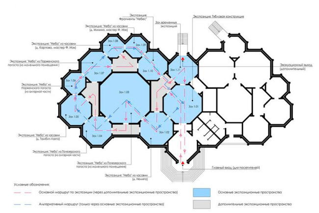 В храмах «небеса» являлись частью конструкции и опирались на стены, сообщая им достаточно серьезную нагрузку, достигающую нескольких тонн. В залах депозитария «небо» – уже не часть конструкции, а экспонат. Это подчеркнуто тем, что каждый комплекс заключен в свое пространство «восьмерика» и при этом «оторван» от стен. Архитекторы предлагают два маршрута по основной экспозиции. Один включает только залы с небесами, второй – более сложный и комплексный: он захватывает «соединительные» пространства и позволяет погрузиться в историю и культуру Русского Севера чуть глубже. Стены залов по своей структуре и цветовым решениям отсылают к внутреннему убранству северных деревянных храмов. Здесь используется палитра, заимствованная из живописи «небес». В нишах, как представляется, удобно размещать и экспонаты, и тексты, поясняющие «карту» неба, его историю и особенности. В схожей манере решены и вспомогательные помещения. В восточном крыле разместятся технологичные пространства для хранения живописи, икон и других предметов из музейных коллекций «Кенозерья», а также реставрационные мастерские. Общая площадь депозитария – 1853 м2.