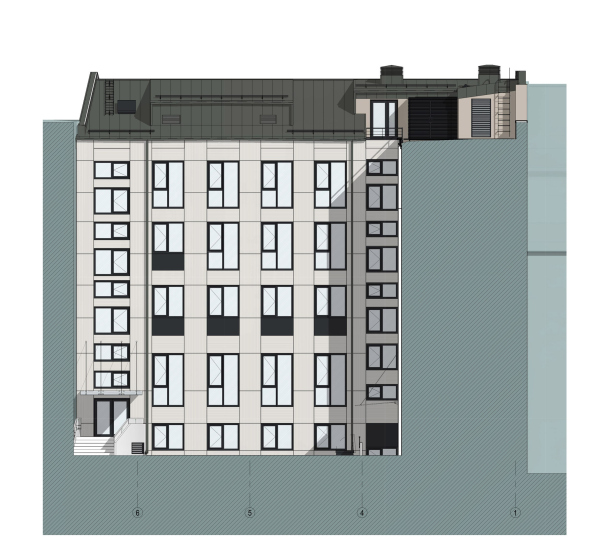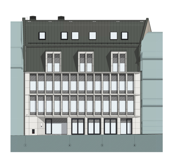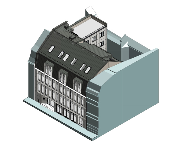Здание деликатно вписано в историческую застройку, высота и рисунок фасада соответствуют масштабу улицы, в вечернее время архитектонику подчеркивает дизайнерская подсветка.