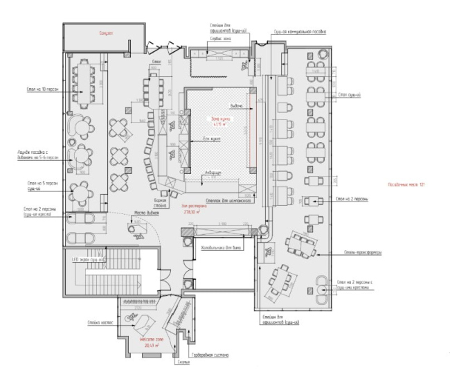 Решения Планировка ресторана сделана максимально функциональной. Бар расположен в центре помещения, рядом с открытой кухней. Это дало красивый обзор при входе в ресторан и разделило ресторан на левую и правую часть, что более удобно для размещения разных компаний, а также расширило варианты визуальных и функциональных сценариев.