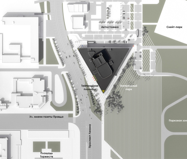 Роль театральной площади в ее классическом понимании играет благоустроенное пространство, протянувшееся вдоль проспекта Ленина – самой оживленной городской магистрали. Несмотря на то, что треугольник – равносторонний, его южная вершина, обращенная к Аллее Славы, наиболее значима в градостроительном плане. Она прекрасно просматривается с дальних точек и играет роль своеобразного маяка. Вокруг нее архитекторы разыгрывают основной архитектурно-художественный сценарий.