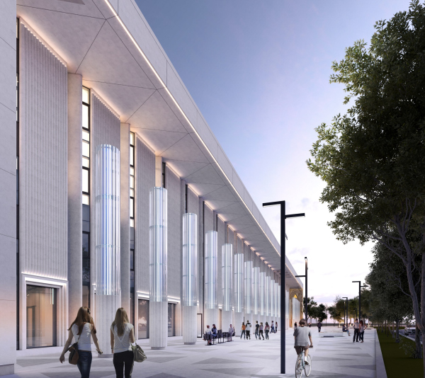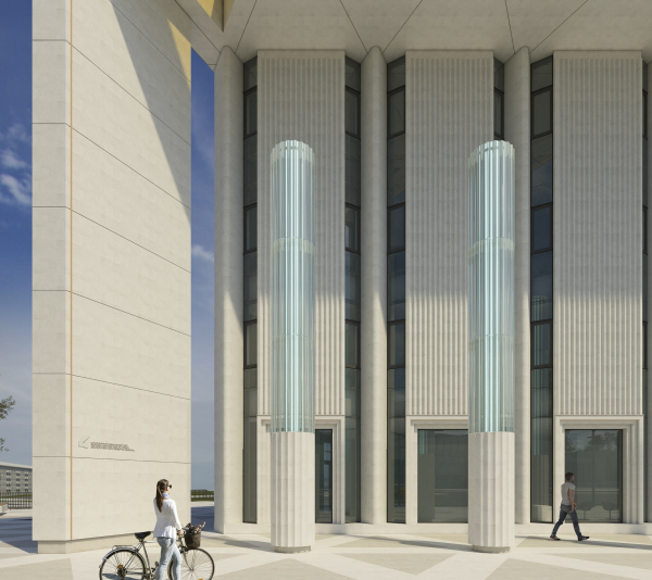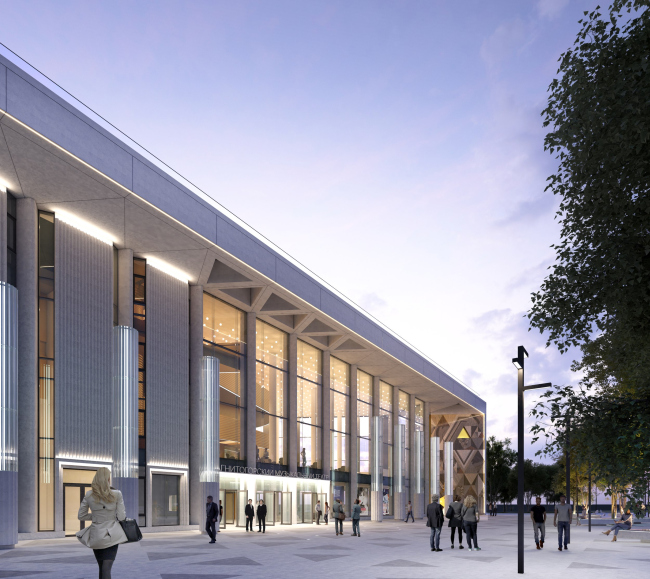 Тему каннелированных пилонов продолжают установленные вдоль фасада стеклянные колонны – праздничные городские светильники. Они не только усиливают вертикальный ритм композиции, но и создают визуальный рефрен с неоклассической сталинской архитектурой, интерпретируя ее в современном ключе. Благодаря чередованию света и тени формируется торжественный и упорядоченный фронт, задающий зданию масштаб, соотносимый с городской средой.