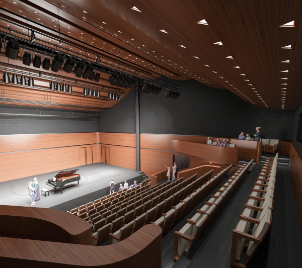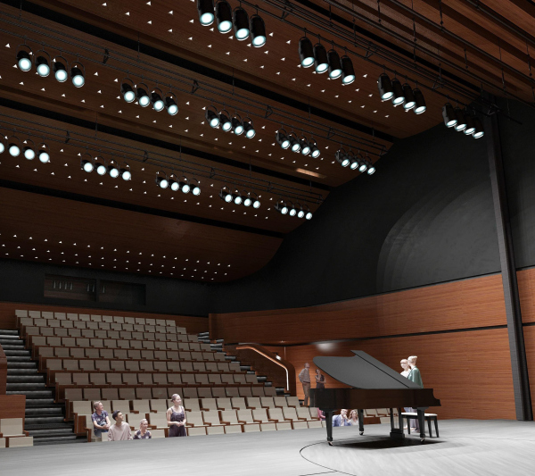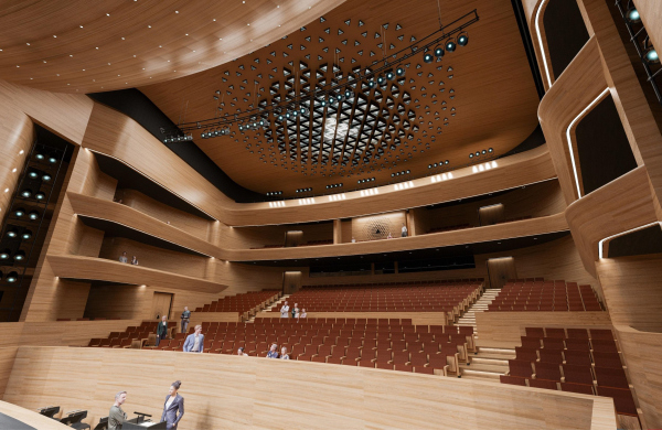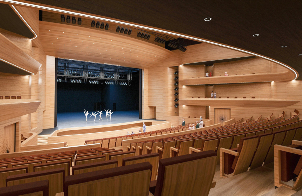 Интерьерные решения пока в работе, но образ и характер пространств в целом уже понятны. Фойе и зрительные залы отделаны деревом теплого золотистого и коньячного оттенков. По идее архитекторов, выраженный контраст между внешней сдержанной «холодной» оболочкой из фибробетона, стекла и металла и «теплым» интерьером создаст ощущение вхождения извне в таинственный мир высокого искусства.