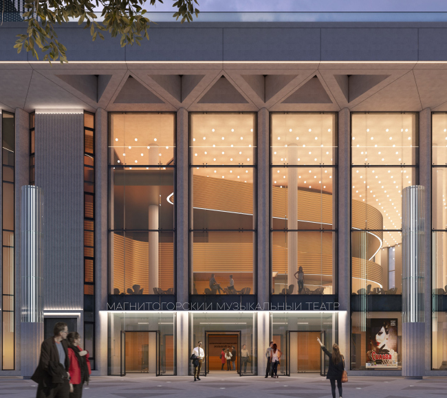 Всеволод Медведев, руководитель архитектурного бюро «Четвертое измерение» «Театр – объект штучный, можно сказать коллекционный. Здесь нет наработанных приемов, заранее заготовленных идей или типовых решений. Всегда работа с чистого листа, и в этом для архитекторов и художников главная творческая ценность и профессиональный вызов. Этот театр для нас был особенно интересным и ответственным, ведь его появление к 100-летнему юбилею города станет значимым событием, которого очень ждут жители и артисты. Необходимо было создать новый городской символ, многофункциональный, гибкий комплекс, где одинаково комфортно можно ставить оперу, балет, драматические спектакли, проводить симфонические концерты, торжественные городские мероприятия и, что очень важно, принимать любые гастрольные коллективы. Отсюда и более общее название – Новая сцена музыкального театра». КонцепцияТеатр в Магнитогорске – не первая работа архитектурного бюро «Четвертое измерение» в этом жанре. Можно сказать, что проектирование театрально-зрелищных зданий много лет является их специализацией.