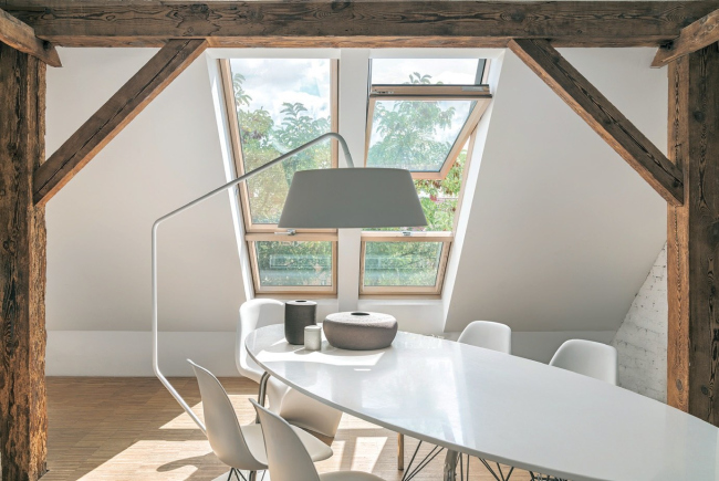 Классические проблемы мансардных пространств – нехватка свободного места у наклонных стен, сложность обслуживания окон, ограниченная функциональность – сегодня решаются инженерными инновациями. К ним относится окно , чья идея базируется на оригинальной концепции комбинированного верхнеподвесного и среднеповоротного окна. В новой модели оно позволяет открывать створку до 45°, что почти на 30% больше по сравнению с предыдущей моделью. В мансардах, где каждый квадратный метр на вес золота, возможность полноценно использовать пространство у окна делает подходы к планировке более гибкими.
