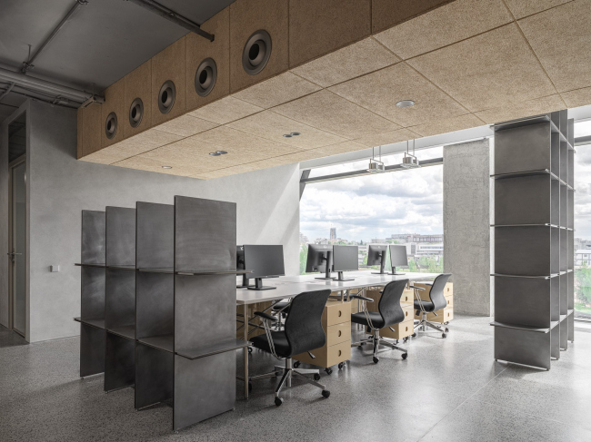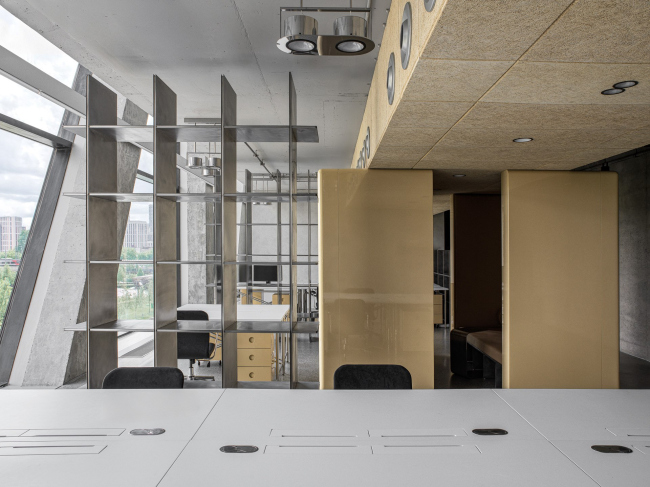 Большое внимание уделено инженерным системам: из-за невысоких потолков все основные коммуникации собраны в лаконичный потолочный короб. Центральным элементом стал объемный куб с лаунж-зоной, обшитый акустическими панелями. Почти вся мебель создана по индивидуальному проекту – включая рабочие столы со съемными крышками для коммуникаций и металлические стеллажи, разделяющие open space. Это первый офисный проект бюро в подобном формате, ставший важным опытом работы с корпоративным заказом.