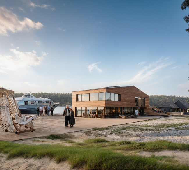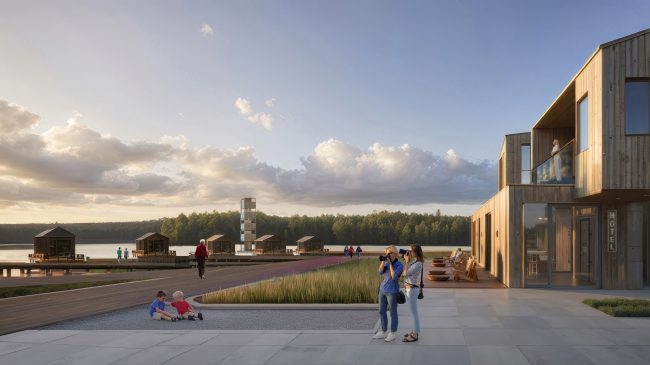 В отделке и конструкциях используются местные материалы: древесина, камень, темные металлические панели. Проект сохраняет дух поморского поселения: деревянные дома до 3 этажей с темными скатными крышами (RAL 9005), причалы из натурального дерева и линейная застройка вдоль берега. Архитектурные акценты – маяк и смотровые площадки отсылают к морской истории, а использование местных материалов (древесина, камень) вписывает новые объекты в существующий ландшафт. Северный ландшафт здесь становится основой для арт-объектов и сезонных инсталляций из дерева и камня, которые подчеркивают изменчивость природы приполярья.Проект 2. «Шальский» (Республика Карелия)Концепция: «Путевой камень на перекрёстке туризма Онежского озера»