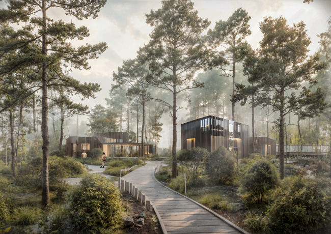 Архитектурные решения поддерживают общую идентичность местности и используют зеркальные поверхности для создания иллюзий и сложных перспектив. Прогулочные лесные зоны причудливо изгибаются в местном ландшафте. Архитектура объектов проекта использует скатные кровли с множеством плоскостей. Также архитектурные решения проекта предполагают использование традиционных объемов сеней, крыльца и балконов в современных типологиях пространств.