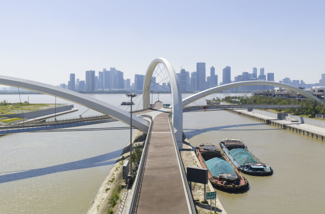 Новый мост соединил разделенные каналом части променада и нового парка площадью 14,7 га вдоль левого берега Цяньтанцзян, а также половины района Цзянхэхуэй, также называемого «бесшовным городом». Он строится по мастерплану ZHA с конца 2020-го; здесь появится порядка 836 тыс. м2 офисов, премиального жилья, отелей 5*, магазинов и ресторанов, «бесшовно», то есть гладко и комфортно связанных с центром Ханчжоу двумя станциями метро.