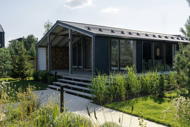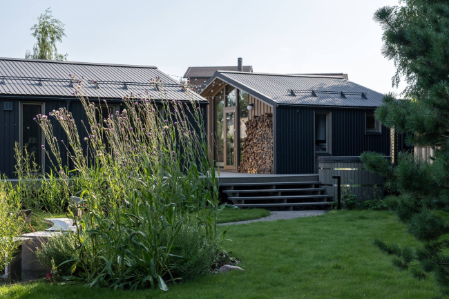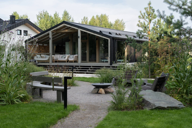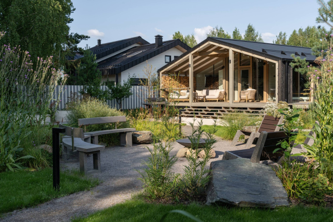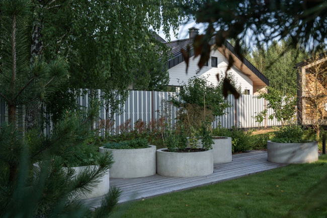 Для дома в Тверской области Easybureau спроектировало так называемый малоуходный сад: неприхотливые растения-«бунтари» осваивают пространство с некоторой долей непредсказуемости и создают живописный ландшафт, не требуя частого вмешательства человека. Посадки дополняют две лужайки, огород из бетонных колец-грядок, костровище, а также уголок нетронутого леса с подберезовиками.