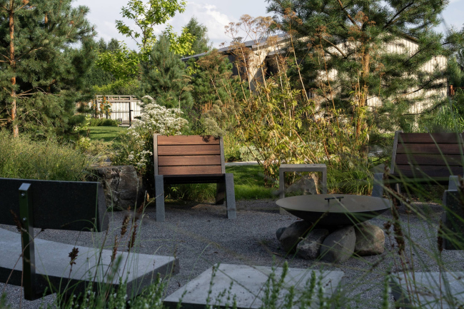 Вокруг костровой разложены крупные камни, между которыми гармонично вплелись травы. Это место для тихих вечеров у огня, созерцания и единения с природой – там, где рукотворное постепенно растворяется в диком.