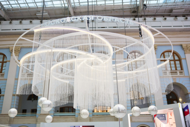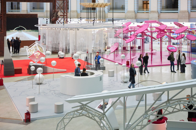 Экспозиция архитектурно-градостроительного комитета Московской области, привычно составляющая пандан стенду МКА на входе в основное пространство Зодчества 2025, рифмуется с ним визуально как открытый объект, приглашающий войти на подиум, пообщаться – он тоже выстраивает некое скульптурное «насаждение» из объектов. Только здесь больше свободного пространства, а вместо дисков – шары и цилиндрические пуфики. И еще – всё белое. Впрочем тема выставки Московской области совершенно другая – она посвящена историческим поселениям. Точнее городам с таким статусом. Называется: «Бесценное ожерелье исторических поселений». Оно, правда, бесценное. В области 74 города, 22 из них имеют статус исторических поселений.