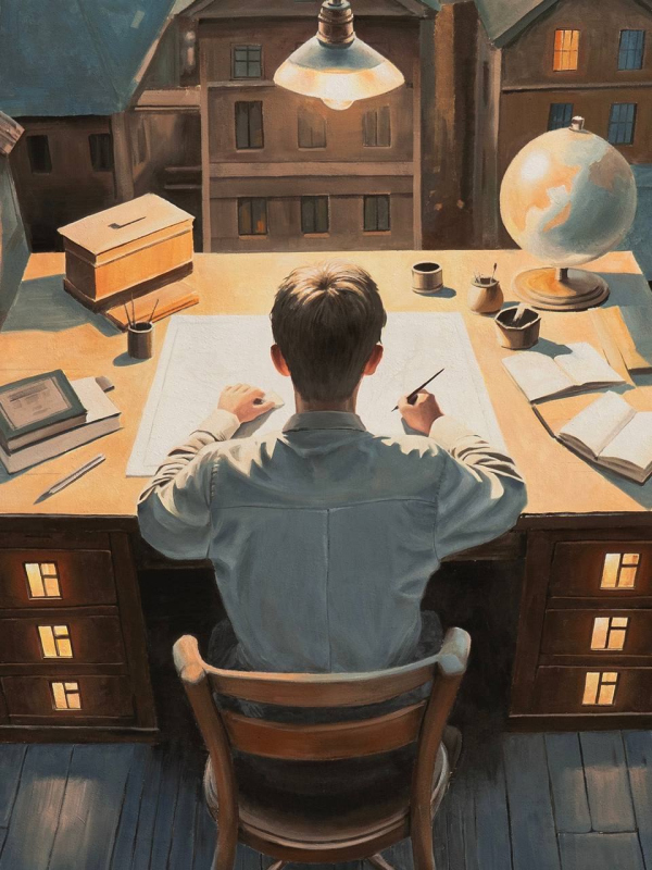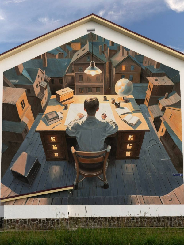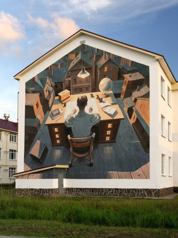 Андрей Оленев На фасаде дома по улице Байкальской художник из Нижнего Новгорода создал собирательный образ картографа Сахалина. Герой росписи возвышается над городом, словно над разложенной картой. Теплые цвета и мягкий свет в окнах создают ощущение уюта и тишины, а сочетание линейной и воздушной перспективы – ощущение сна или сказки. В середине 2010-х годов Андрей Оленев приобрел известность благодаря масштабным росписям на старых деревянных домах в историческом центре Нижнего Новгорода. Его работы отличали авторские сюжеты, вдохновлённые искусством Северного Возрождения – вниманием к деталям, символами и поэтичностью, которую художник сохраняет и в своих сегодняшних проектах.