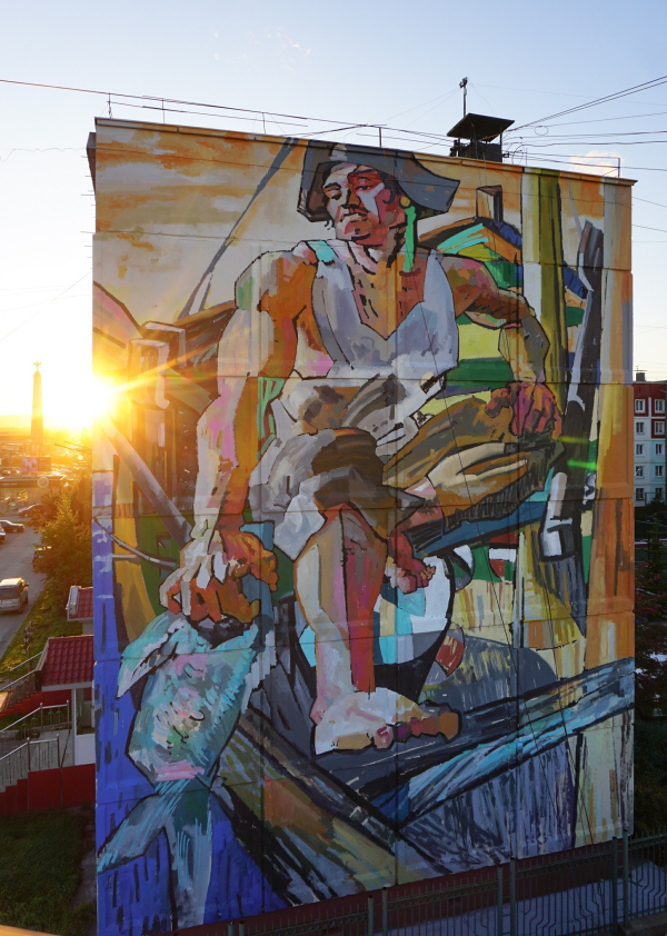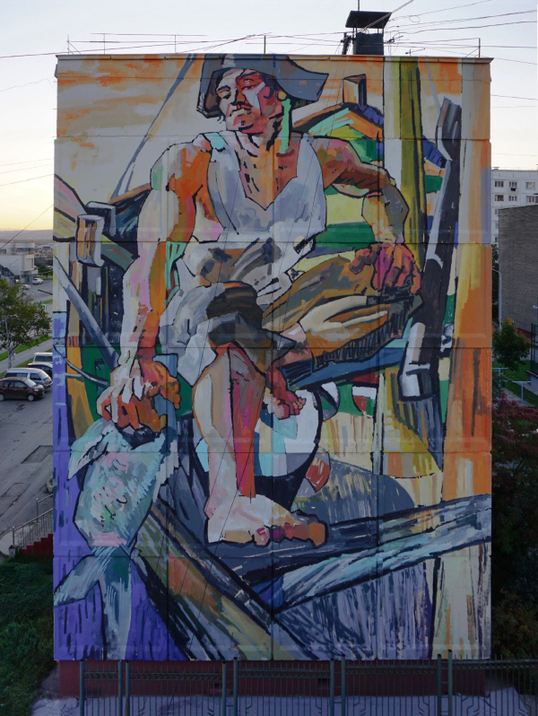 Илья Федотов Художник из Нижнего Тагила посвятил мурал сахалинцам, чья жизнь связана с морем. На фасаде изображен островитянин, занятый рыбным промыслом – традиционным занятием жителей Сахалина. Широкими, грубыми мазками и красочной палитрой автор представляет зрителю образ сильного и опытного добытчика. Композиция росписи построена на принципе крупных разноцветных плоскостей, которые пересекаются под острыми углами, в чем можно найти перекличку с эстетикой синтетического кубизма и футуризма, с одной стороны, и с эстетикой советского барельефа, с другой.