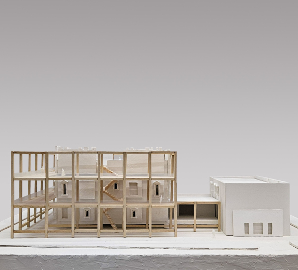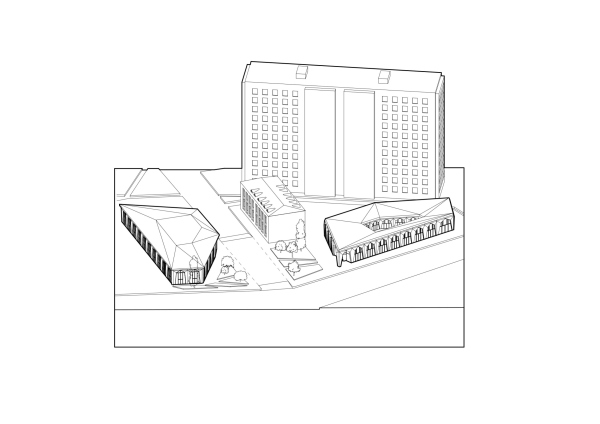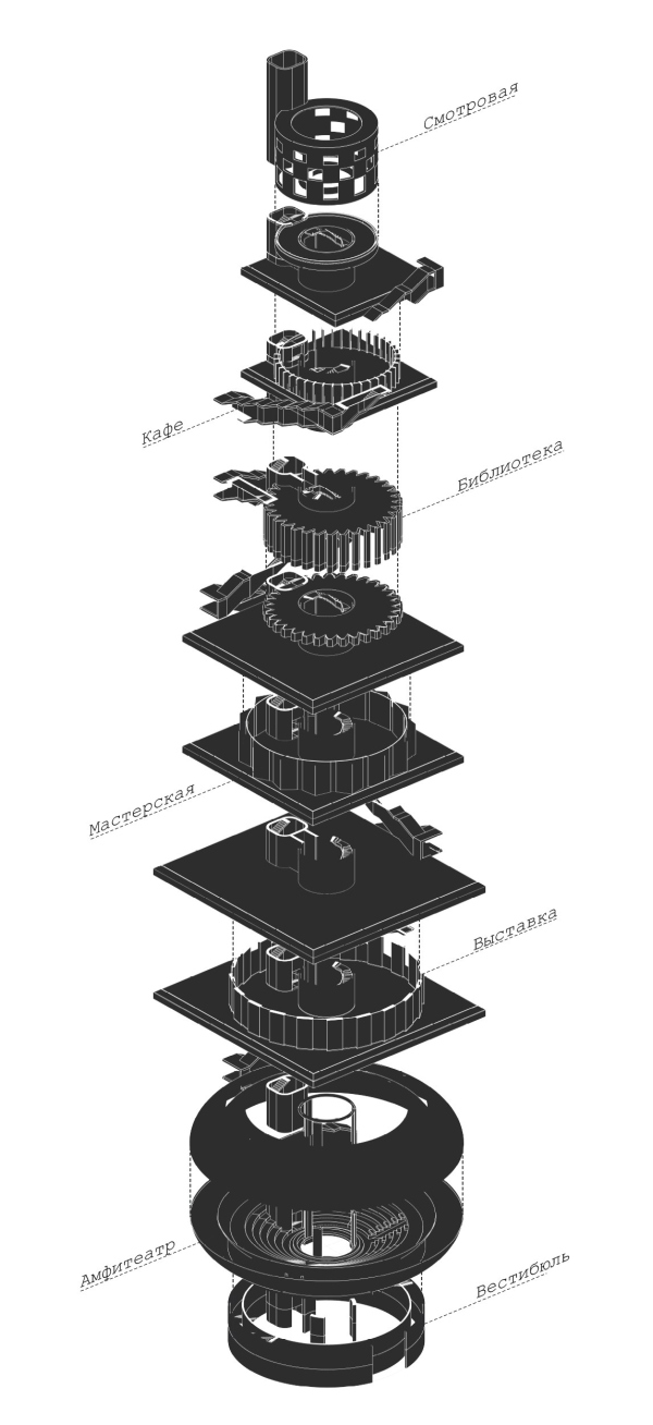 Клуб «Пента» Егор Трофимов Изучая Басманный район Москвы, нельзя не заметить большую концентрацию вузов. Моей задачей стало объединить студентов в одном месте для передачи опыта, новых знакомств и, самое главное, дать пространство для работы и досуга. Логично, что выбранный участок должен находиться равноудаленно от учебных заведений: им стало пересечение Денисовского переулка и Доброслободской улицы. В процессе было решено разъединить клуб на два корпуса, расположенные по разные стороны улицы: досуговую зону с концертным залом и рабочую с мастерскими и библиотекой. Для связи и беспрепятственного доступа улица была понята до уровня тротуара, образуя небольшую площадь. Получившаяся форма напоминает провинциальные торговые ряды, конструктивная основа которых – крестовый свод, образованный арками. Взяв это на вооружение, я создал на основе свода модульную арочную ячейку, которая является пространствообразующим элементом клуба. Пересечения линий имеют важную формообразующую функцию – в одном случае это внутренний сад, в другом – зрительный зал. Корпус с мастерскими выстроен вокруг сада, который работает как досуговая зона, где можно погулять и выдохнуть. «Каменный городок»Елизавета Ефанова, Софья Киселева  Проект «Каменный городок» представляет собой единый архитектурный ансамбль, внешне напоминающий группу скал. Два на первый взгляд разных объекта – ремесленные мастерские для работ с камнем и спортивный клуб скалолазания – имеют много общего: они связаны единой внутренней логикой и обращаются к образу гор. Резьба по камню, как и скалолазание, в своём стремлении к вершине, требует мастерства, физической силы и совершенствования навыков. Резчик взаимодействует со структурой камня, убирает всё лишнее, придавая ему нужную форму. Скалолаз создаёт свой путь, прокладывает маршрут, также контактируя с камнем. Басманный район Москвы – место с богатой историей, где камень зачастую играет не последнюю роль. А резьба по камню – это традиционное ремесло, которое веками помогало украшать здания, создавать скульптуры и предметы быта. Размещение скалодрома в историческом квартале создаёт контраст, привлекающий внимание и вносящий новую атмосферу. Клуб “Труба”Семён Самсонов  Основная задача при проектировании клуба заключалась в совмещении образа с историческим смысловым контекстом, создании архитектурной доминанты, которая отсылает к индустриальному наследию района. Клуб находится на территории усадьбы Демидовых – династии русских промышленников и меценатов, превративших металл в символ созидания. Участок имеет крупный внутренний двор: проект становится его началом и открывает доступ с главной улицы. Его цель заключается в собрании всех общественных пространств в вертикальную структуру для минимизации площади основания. Так появляется яркий образ, схожий с трубой. Рядом с историческим зданием, здание клуба переосмысляет индустриальное наследие как современное пространство культуры, философии и созидания. Граффити-лабиринтСофия Симонян  Моей целью являлось создание уникального пространства, легализующего и интегрирующего творчество уличных художников в городскую среду. Проект создавался для участка с высокой социальной активностью – бывшей промышленной территории, ставшей точкой притяжения для молод