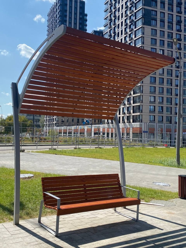 На объекте в Электролитном проезде, 7А акцент сделали на создании комфортных зон отдыха. Здесь установили шесть пергол «Волна» в комплекте со скамейками «Глория Вуд». Инфраструктуру дополнили велопарковки «Спираль» из нержавеющей стали и практичная контейнерная площадка «МАФ-6» с хозблоком.