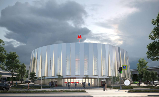 Павильон станции представляет собой цилиндр-шайбу – согласно авторскому , «гигантскую шестерню». Что, в целом, достаточно распространено среди павильонов 1970-х годов. В отличие от них он асимметричен, приподнимает свою дугу со стороны входа, и облицован серебристым металлом, причем выпущенные вперед под наклоном объемные «клавиши» – просечные. Так что павильон напоминает и «Марьину рощу» БКЛ, и якутскую филармонию. Подземные переходы также отмечены металлической конструкцией: мы видим их только в профиль и пока не понятно, цельная ли она или только по бокам расположены трубки из того же полированного металла. В интерьере станции тот же металл на круглых колоннах, трубах-светильниках и «заворотах» верхней части стен, остроумно совмещенных с вентрешетками. Оккулюс входной части, с круглым световым отверстием и расходящимися от него кругами, решен в обновленных традициях московского метро: вспомним хотя бы павильон с колонной между эскалаторами на «Курской». Тем не менее металл, опять же в метрошных традициях, сочетается с мозаикой. Вспомним хотя бы Корина на «Комсомольской».