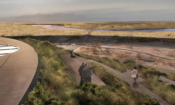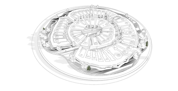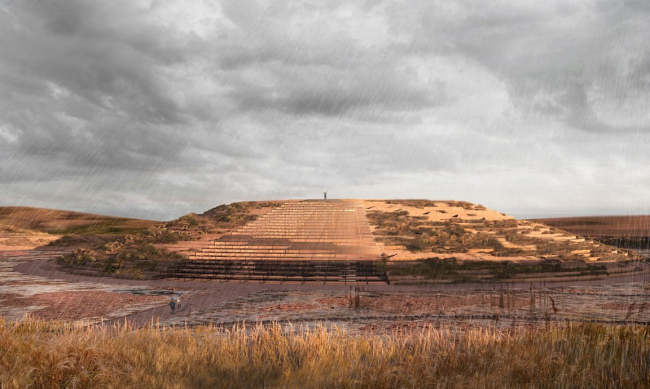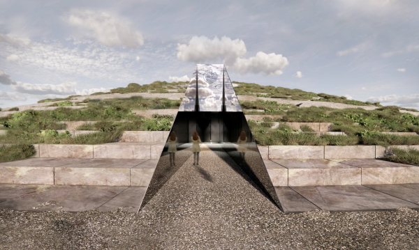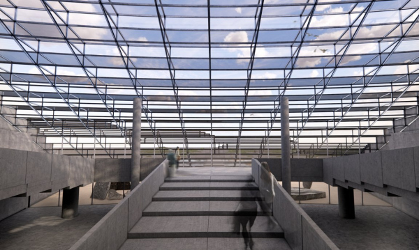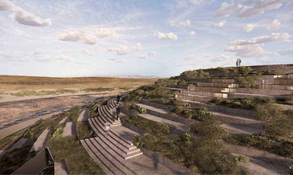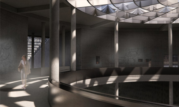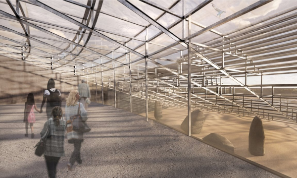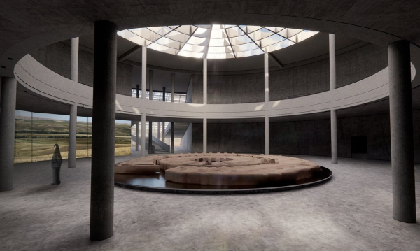 Музей углублен на 5 метров под землю, это обеспечивает бережный подход к существующему ландшафту и создает метафору найденного археологического объекта. Благодаря озеленению фасада и зеркальным панелям входной группы архитектурное сооружение естественно продолжает окружение, а кратер становится зоной отдыха для посетителей музея. Вокруг музейного здания размещен искусственный бассейн, заполненный керамическими черепками. Это временно подтопляемая территория: во время дождей и таяния снега бассейн заполняется водой.
