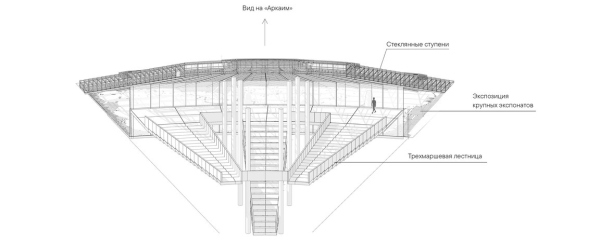 Стеклянная лестница отделяет макет на первом этаже от вида на настоящее городище, привносит в здание больше света, создает яркие, узорчатые тени. Витрину с крупными экспонатами, расположенную под лестницей, можно рассмотреть как внутри, так и снаружи здания. На втором этаже располагаются залы с постоянной экспозицией.Конюшенные Двор, Музей и Площадь. РевитализацияВероника Гареева