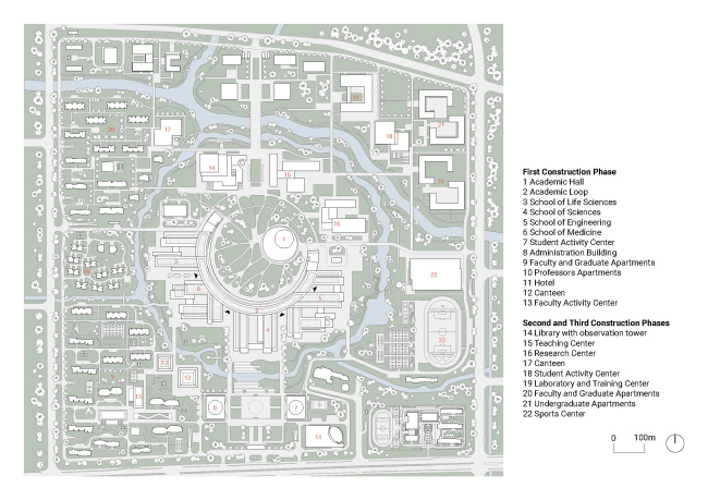 В основе концептуального мастерплана лежит серия концентрических кругов, которые расходятся от тоже круглой в плане центральной аудитории и помогают логично и эффективно организовать все функции: большой, опять же круглый, двор, вокруг которого сформировано академическое ядро из связанных между собой отдельных корпусов инженерной, медицинской, естественно-научной школ и школы технических наук. Кольцо замыкают три отдельных объема – библиотеки, исследовательского корпуса и центра педагогики. Благодаря также кольцевому каналу все они оказываются на острове, а с общественно-административной, спортивной и жилой «внешними» частями кампуса это обособленной ядро соединено 12 пешеходными мостиками.