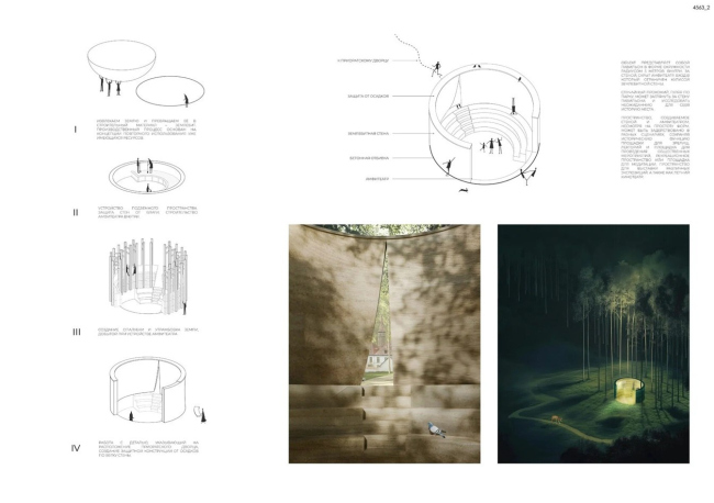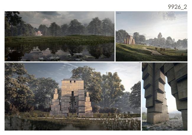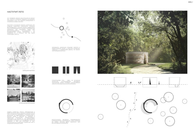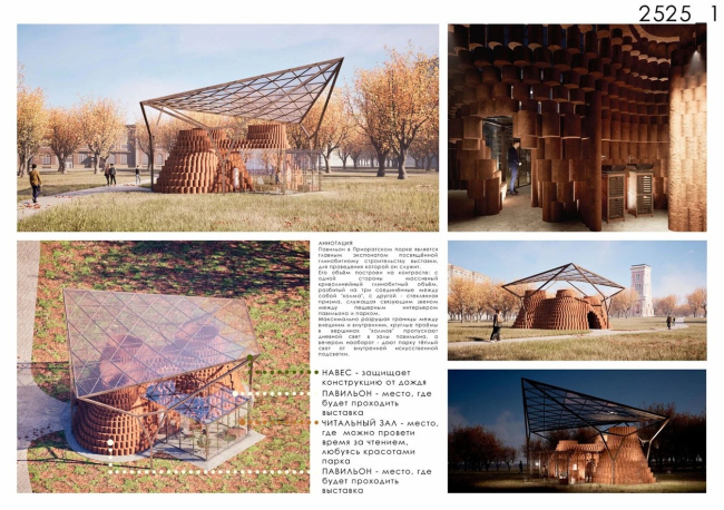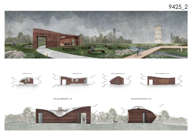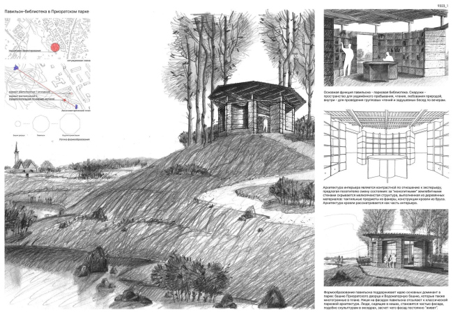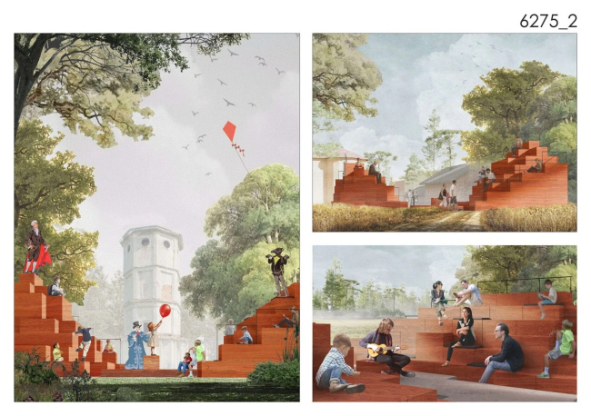 Победивший проект – это павильон с функцией парковой библиотеки. За монолитными стенами – уютные деревянные стеллажи с книгами. Многогранный план напоминает о башне Приоратского дворца и Водонапорной башне ансамбля. Павильон органично вырастает из холма, развивая логику пейзажного парка. Отказавшись от монолитного основания, авторы размещают павильон прямо на рельефе, не вмешиваясь в него. Приподнятая на стропилах, «облегченная» кровля подчеркивает его временный характер. Люди, сидящие в нишах снаружи, уподобляются парковой скульптуре в экседрах. В проекте нет ни единого избыточного элемента: каждое решение продиктовано логикой материала и уважением к месту.