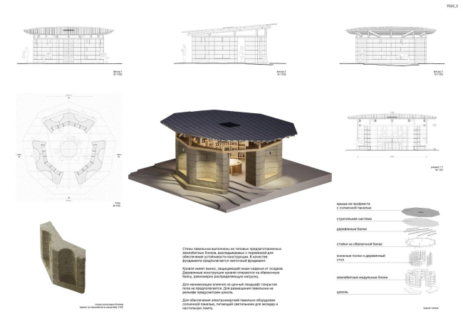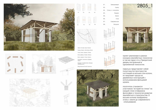 Проект работает с идеей павильона-нарратива. Восемь землебитных стен-колонн, накрытых фальцевой кровлей на деревянных стропилах, образуют открытое круговое пространство, где каждая поверхность – часть истории технологии землебита: от первобытных глинобитных жилищ до её современного переосмысления.