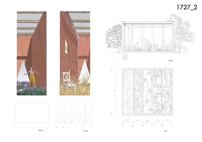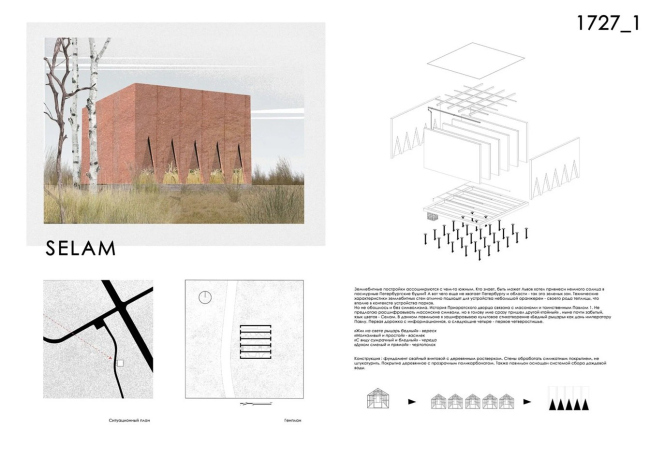 Отправной точкой для автора стала история Приоратского дворца, неразрывно связанная с масонской символикой и культурой XVIII века. Павильон задуман как своего рода шифр: его конфигурация кодирует «язык цветов» Селам и отсылает к стихотворению Пушкина «Бедный рыцарь». Маршруты внутри – это строфы, которые посетитель проходит в буквальном смысле ногами. Конструктивно проект предполагает устройство оранжереи: теплоаккумулирующие землебитные стены создают стабильный микроклимат, а кровля из прозрачного поликарбоната пропускает свет к растениям. Павильон также оснащен системой сбора дождевой воды.