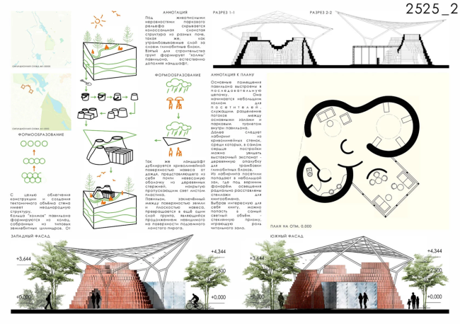 Авторы превращают сам павильон в экспонат выставки о землебитном строительстве. Три соединённых между собой рукотворных «холма» из трамбованного грунта образуют массивный криволинейный объём; контрапунктом служит стеклянная призма, стирающая границу между «пещерным» интерьером и парком. Окулюсы в вершинах «холмов» работают как источник света днём и подсветка окружения вечером. Грунт для строительства взят здесь же. Внутренний маршрут продуман от входного холла через лабиринт демонстрационных стенок к центральному залу со стеллажами для книгообмена.