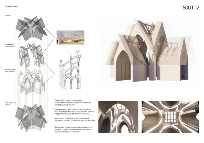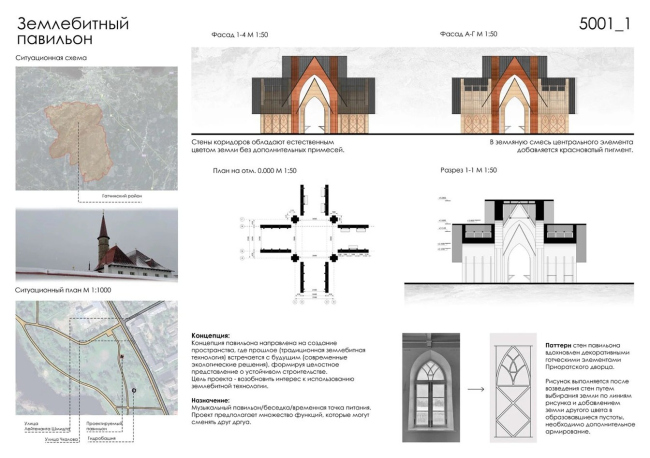 Это проект музыкального павильона-беседки. Декоративный рисунок на стенах воспроизводит готические мотивы Приоратского дворца, но выполняется нетрадиционным способом: после возведения землебитных стен в них выбирают грунт по заранее нанесённым линиям и заполняют получившиеся углубления материалом другого цвета, придавая поверхности рельефность. Силовой каркас павильона принципиально следует готической логике: деревянные контрфорсы принимают распор, а стены из прессованных земляных блоков работают преимущественно на сжатие. Места для сидения встроены вдоль стен – так внутреннее пространство превращается в камерный зал для музыки.