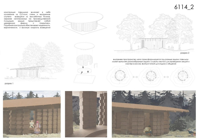 Здесь нет ни символических отсылок, ни нарративных программ – только честная демонстрация того, что умеет землебитный блок. Прямоугольные блоки стандартного размера складываются в цилиндрический объем (похожий на проект-победитель). Два ряда внутренних «ступеней» одновременно служат дополнительной защитой от влаги и превращаются в сидячие места во время лекций и мастер-классов.