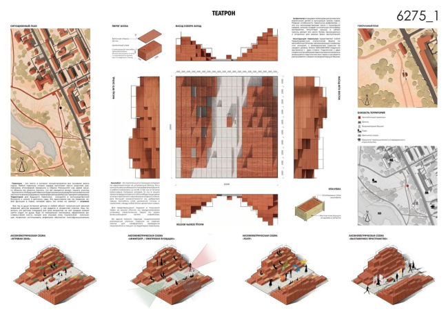 Соседство с детским садом и школой определило функциональную программу этого проекта. Террасированная ступенчатая форма из землебитных блоков – своего рода зиккурат – позволяет детям карабкаться, сидеть и смотреть представления одновременно. Конструкция раскрывается с двух сторон, как ворота, – с одной стороны открывая вид на водонапорную башню. Отсутствие кровли и жёстких границ делает пространство максимально проницаемым: здесь может идти и кукольный спектакль, и урок природоведения, и просто свободная игра.