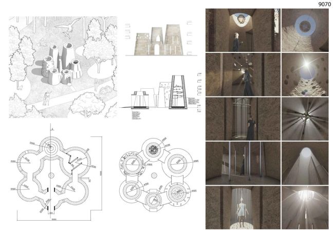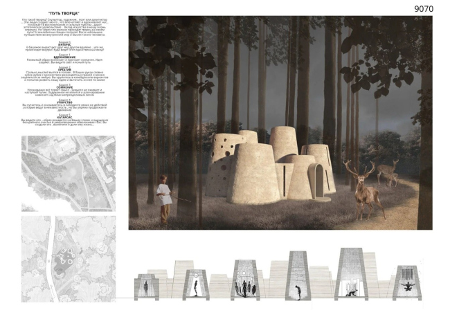 Проект «Путь творца» работает с образом. Несколько башенок разной высоты, похожих на песчаные куличи, вырастают одна над другой – каждая чуть меньше предыдущей – и образуют ступенчатый силуэт, который читается издалека как скульптура. Окулюс в кровле каждой башни связывает пространство с небом и меняет световой рисунок на стенах на протяжении дня. Образ намеренно размытый: это может быть и маяк, и вавилонская башня в миниатюре, и просто игра со временем и светом.