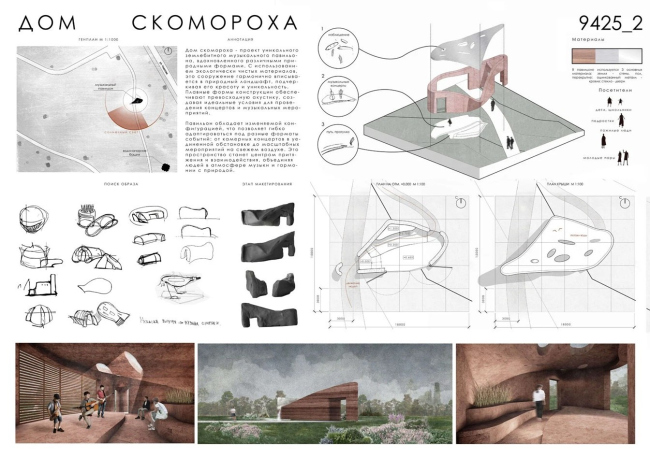 «Дом скомороха» – павильон-трансформер, чья конфигурация меняется в зависимости от программы. Вдохновлённая природными формами пластика объёма создаёт систему пространств, которые легко переключаются между форматами: камерный концерт, открытое выступление, уединённое место для отдыха. Землебитные стены образуют звуковой резонатор.