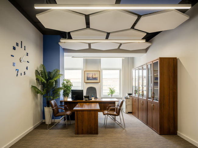 Снижение спроса на спокойные нейтральные оттенки в офисах дизайнеры связывают с противоречивыми ассоциациями: зачастую такой интерьер кажется излишне расслабленным, а потому неуместным для рабочих помещений. Сгладить этот эффект помогают акцентные цветовые решения, которые привносят в обстановку энергию и контраст. Например, можно использовать акустические панели для стен и потолков в глубоких плотных оттенках, добавить растения в ярких кашпо. Главное – соблюдать умеренность, чтобы сохранить гармонию.