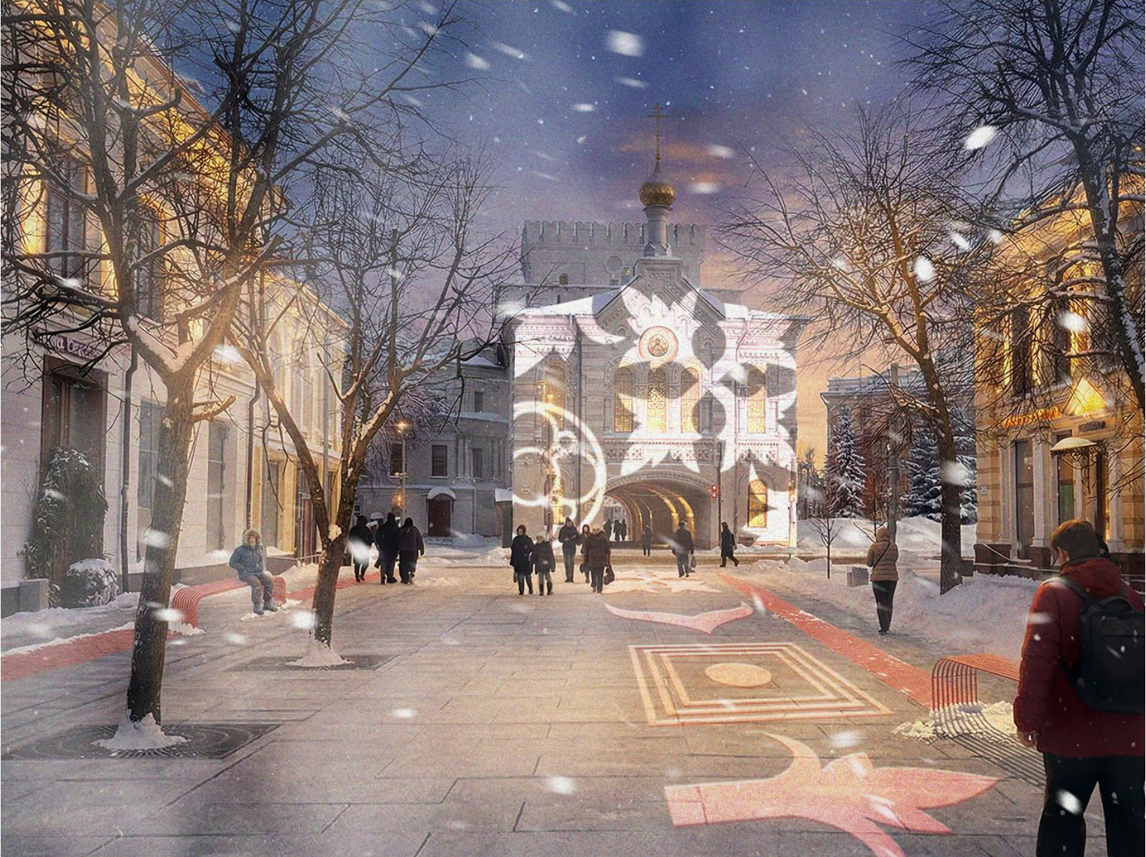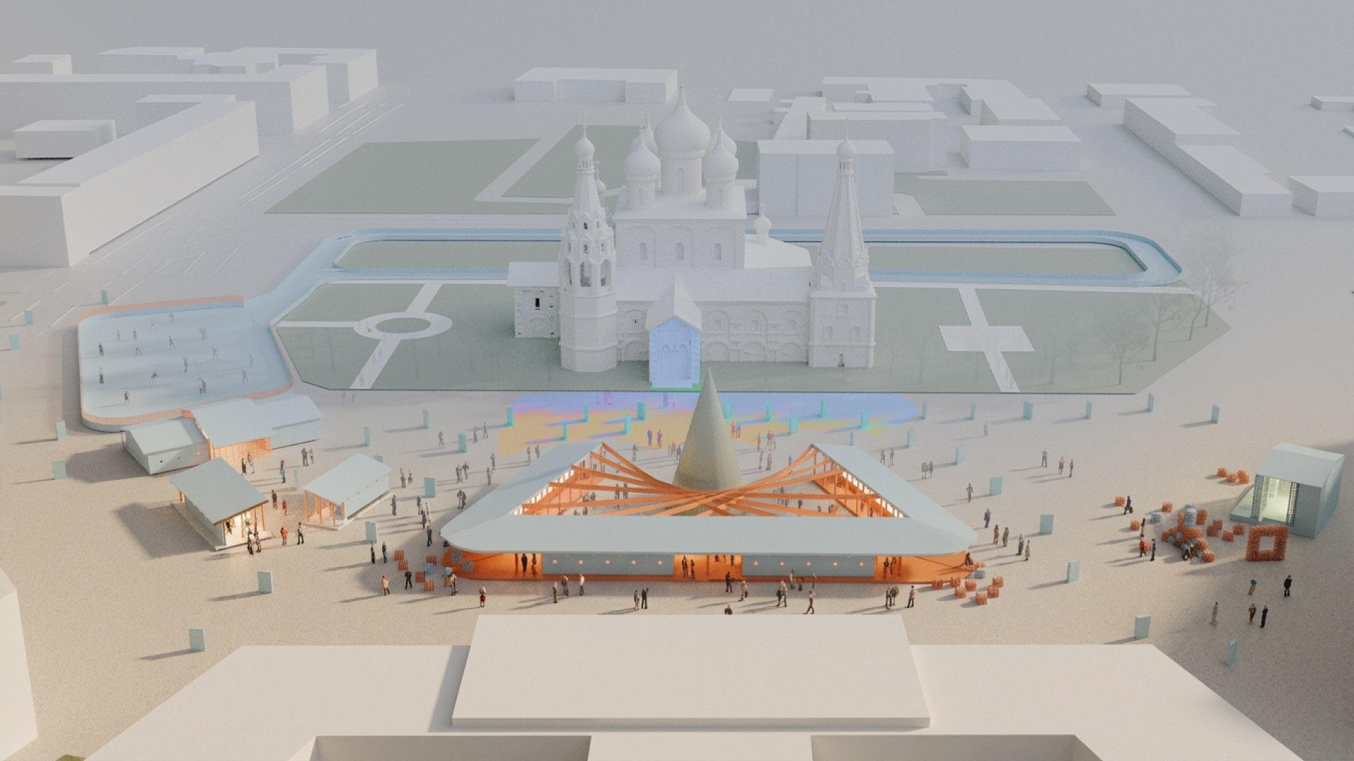 В зимний период площадь трансформируется в центральную городскую площадку для проведения мероприятий. Предусматривается размещение катка, сцены и главной новогодней елки. Композиционное решение сохраняет визуальные коридоры к храму и не перекрывает основные направления восприятия со входов на площадь. Во внепраздничный период площадь функционирует как общественное пространство для повседневного использования. Предусматривается размещение мобильных малых архитектурных форм модульного типа.Команда 4. Парк 1000-летия ЯрославляДарья Иканова (ННГАСУ), Светлана Никонова (МГСУ), Анна Елизарова (ЯрГАУ), Анна Печуркина (ЯГТУ), куратор Ксения Корачун (Ярославль)
