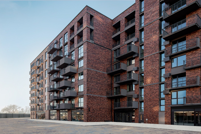 Террасирование применено точечно – как приём, увеличивающий количество квартир с хорошим видом и одновременно разбивающий массив кирпичного объёма. Открытые балконы вместо остеклённых лоджий – осознанная позиция. Балкон освобождён от хранения вещей: в планировках большинства квартир предусмотрены гардеробные и кладовые в прихожих.