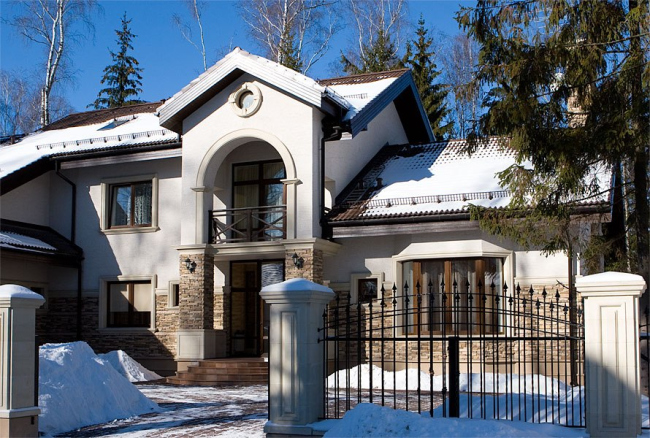 Сегодня в тренде фасадов – четкие линии декора, простые формы наличников и карнизов, штукатурка вместо облицовочного кирпича. Так, в подмосковном шале (частный особняк на фото, проект компании «ТопФасад») выполнена задача – при утеплении сохранить герметичность декоративных узлов в фасаде дома. Также выполнены следующие работы: фасад отделан штукатуркой светлых тонов, которая отлично гармонирует с искусственным камнем, светильники прикреплены к закладным деталям, смонтированы оконные наличники из пенополистирола по базовому пласту СФТК, откосы усилены перфорированными уголками с капельником, под подоконными планками – гидроизоляционные ленты.