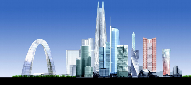 Концепция застройки 24 И 25 участка ММДЦ «Москва-Сити». Сравнение высотности четырех вариантов, слева направо: первый, второй («арка»), третий («Иван Великий»), четвертый (итоговый) © Проект КС