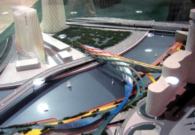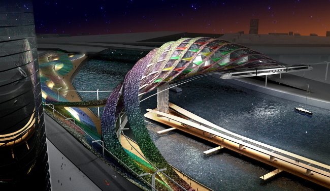 Так или иначе, а проводя летом этого года заказной конкурс на архитектурное решение набережной напротив Сити, компания Mirax Group включила «обитаемый мост» в задание, правда, в виде пожелания, а не требования. Два других участника конкурса – мастерская Дмитрия Александрова и Murray Ó Laoire, тему обитаемого моста не поддержали, сосредоточившись на набережной и прилегающих пирсах. Архитекторы мастерской А.Асадова, напротив, развили тему до предела, устроив на мосту жилье и объединив его одновременно с двумя видами транспортных магистралей – монорельсом и автодорогой. Ход, очень смелый в инженерном отношении.