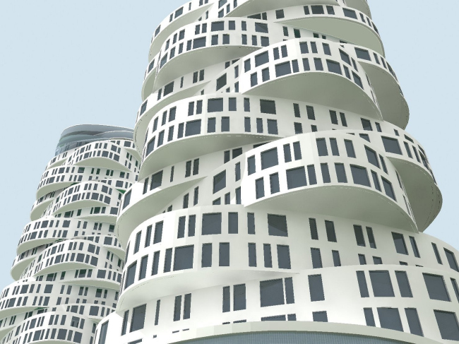 Жилой комплекс состоит из двух башен на общем слегка изогнутом стилобате. Основания обеих башен – овальные, одинаковые и расположены параллельно друг другу. Выше план становится похож на треугольник со скругленными краями, но главная особенность башен – не в этом. Обтекаемо-треугольные объемы разделены на пласты по одному-два этажа в каждом, которые развернуты под углом примерно градусов 30 относительно друг друга. Пласты поворачиваются вокруг общего геометрического центра – стержня, который совпадает с расположением лифтовых шахт зданий. Башни как будто бы сначала нарезали на отдельные платформы, а потом начали эти платформы поворачивать таким образом, чтобы углы выступали.