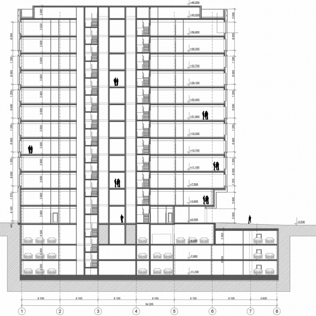 Ведь что представляют собой многие, уже ставшие привычными, московские проекты? Многие из них стремятся занять собой всю территорию полностью, высадив деревья для «компенсации» на крыше. Другие, чуть более скромные, над поверхностью ведут себя прилично, но занимают все пятно застройки под землей – как каменные деревья, пускают свои бетонные корни далеко в стороны. Здесь нет ни того, ни другого, ни третьего – кровля неэксплуатируемая, без висячих садов. Подземная парковка лишь на несколько метров шире видимой части.