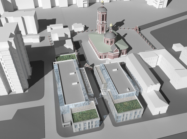 Собственно на их месте и проектируется новый офисный комплекс. Исчезнувший Пименовский тупик выстраивают заново, а заодно восстанавливают кусочек красной линии Краснопролетарской (бывшей Пименовской) улицы. При этом под землю закапывают автостоянку площадью с весь участок (кроме того на минус первый уровень вынесена и столовая). Возникает общий подземный «стилобат», по верху которого и пройдет улочка – наследница Пименовского тупика. А наверху пять бетонных объемов повторяют габариты домов, которые существовали на этом месте до того, как их снесли в 1930-е. Получается деревня с дорогой к храму. Точнее к храмовым воротам, что выглядит весьма символично для района, где раньше жили охранники московских ворот. Так и представляешь себе, как стоят у подъездов курящие белые воротнички, а мимо них старушка в платочке к молитве идет.